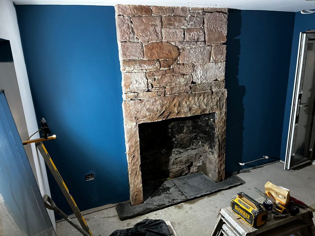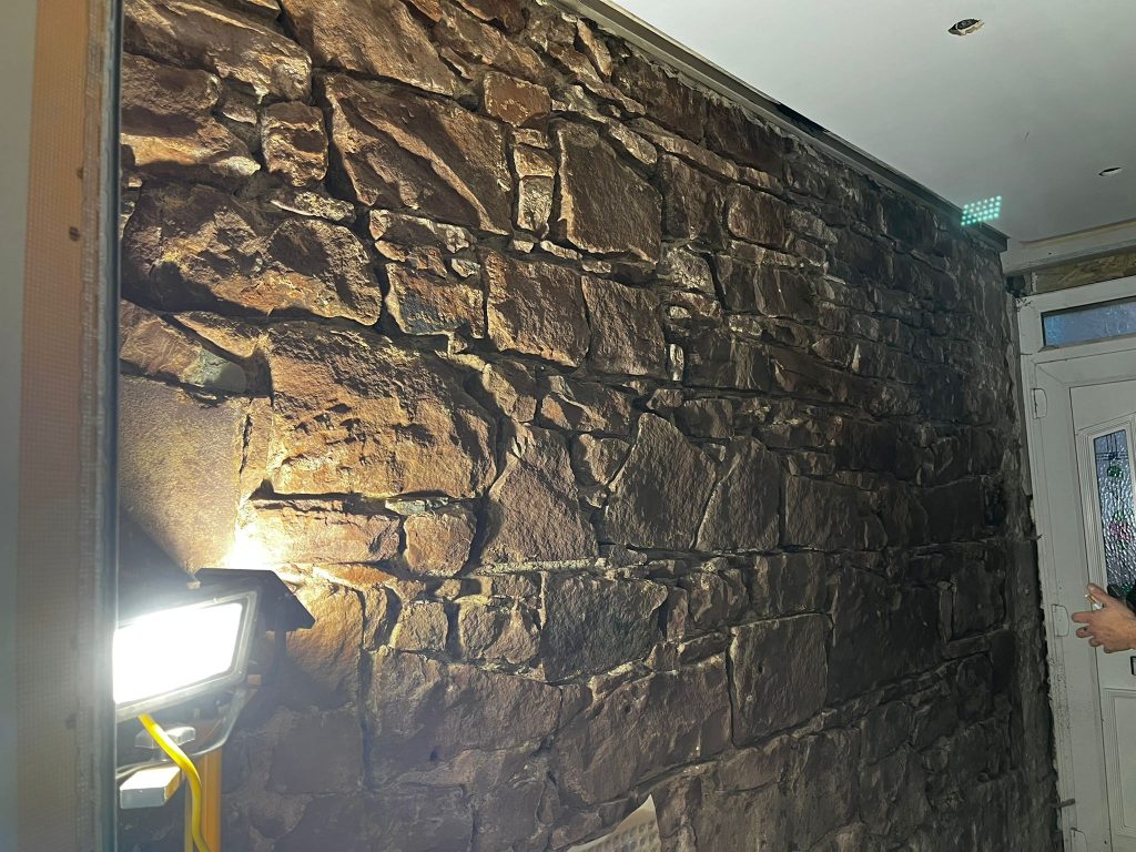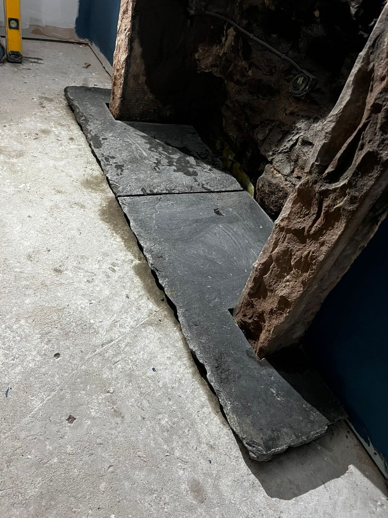 One of the amazing features of this property, is the natural red stone walling featured throughout. Originally used for it’s durability but also availability in the area, these structures now exposed and cleaned down, create such a beautiful feature throughout – really creating the warm, cottage feeling one would expect in a period holiday-let like this one In keeping with this energy, we repurposed some old natural slate slabs that were in the property’s garage, and created this beautifully hand crafted slate hearth for the feature fireplace in the dining area